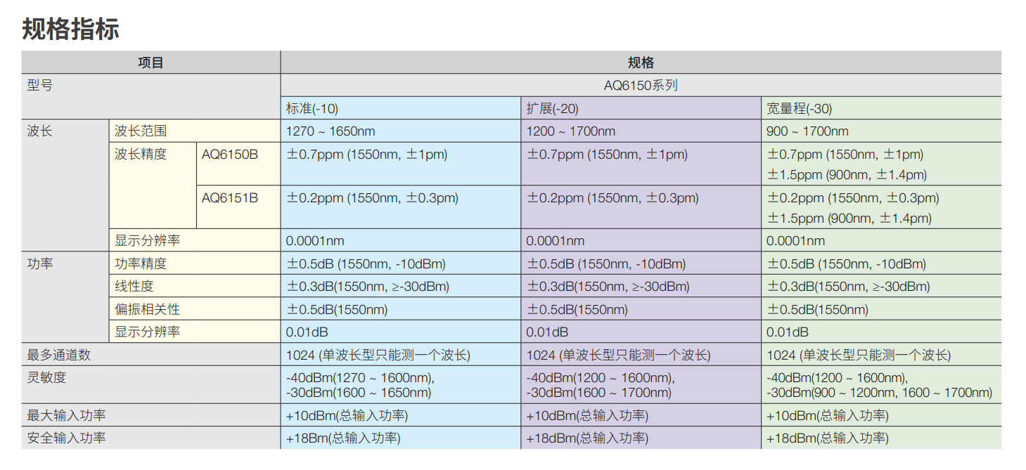 AQ6150系列一共有兩個機(jī)型。其中, AQ6151B是高精度型光波長計,波長精度高達(dá)±0.2ppm,可以滿足高級別的精度測量要求。 AQ6150B是標(biāo)準(zhǔn)型光波長計,波長精度可達(dá) ±0.7ppm,適用于對精度要求不高的測量應(yīng)用,價格更加實(shí)惠。
