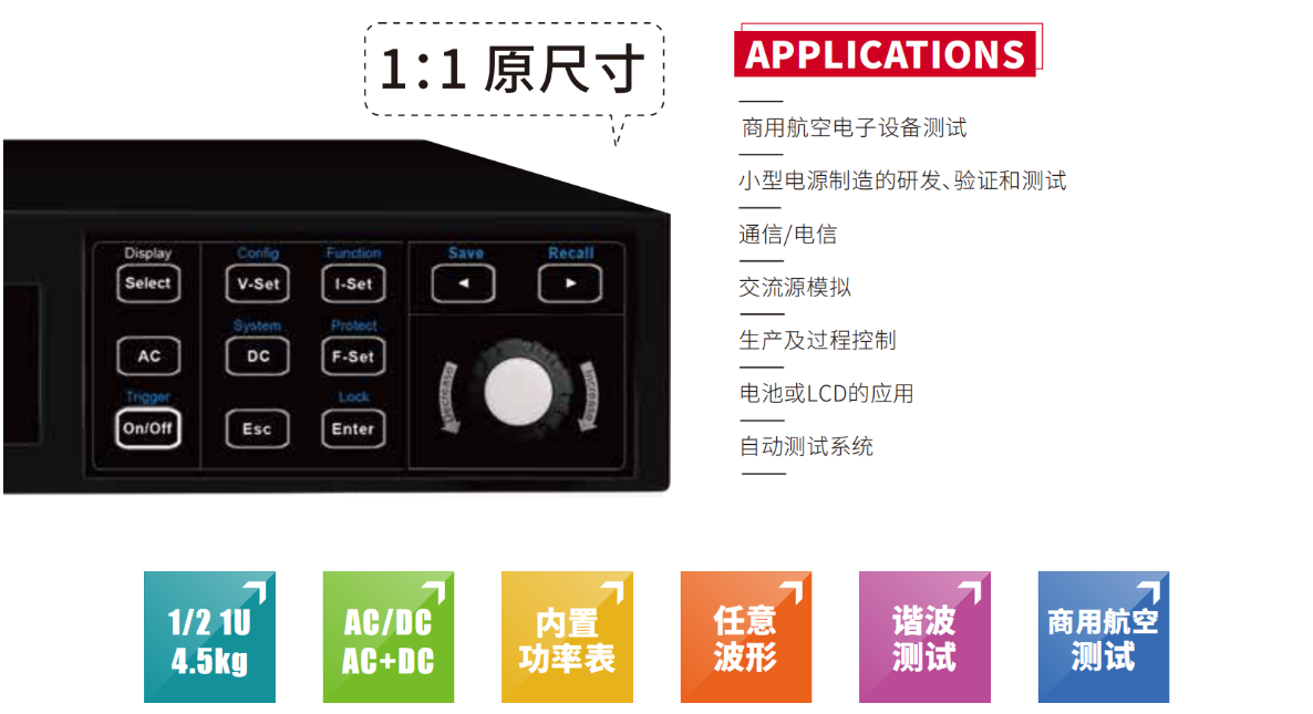 IT-M7700系列高性能可編程交流電源很好地結(jié)合了智能和靈活兩大特點(diǎn),改善了傳統(tǒng)交流電源體積龐大的缺陷,將體積縮小到僅? 1U,很好的增加空間利用率。內(nèi)置功率表和任意波型產(chǎn)生器, 可模擬各種任意波形輸出。結(jié)合了可編程AC和DC電源的先進(jìn)技術(shù),廣泛應(yīng)用于電力能源產(chǎn)品、3C產(chǎn)品、家電產(chǎn)品、工業(yè)電子、IEC標(biāo)準(zhǔn)測(cè)試的開發(fā)和運(yùn)用等多個(gè)領(lǐng)域。